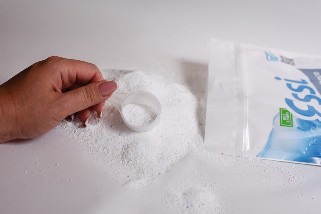 Наш кисневий порошок можна використовувати як самостійний засіб, так і з будь-яким миючим засобом: порошком, капсулами чи гелем.